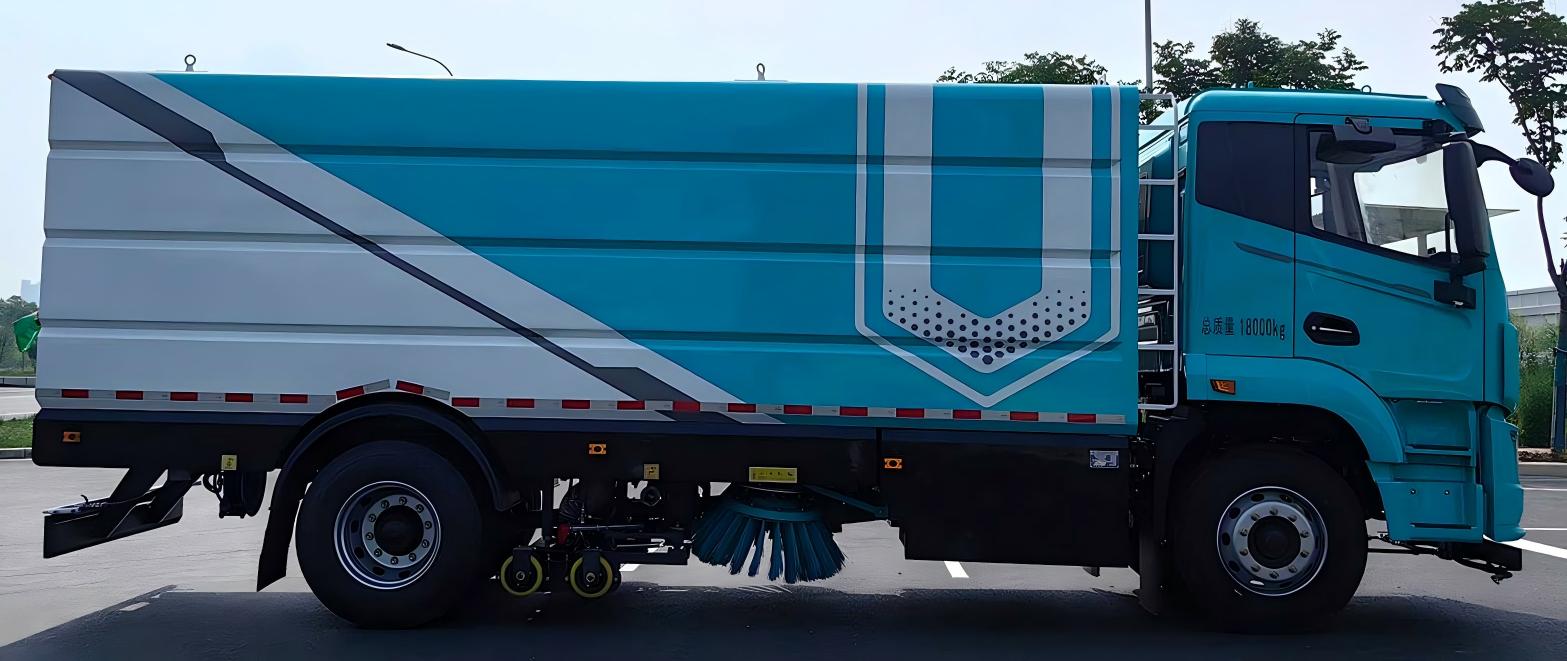 扇形噴嘴噴出的扇形水簾組成一總寬不小于2.8m的U形水刀,直接沖洗路面,沖洗路面后的水被吸回到垃圾箱中,實現路面洗掃。