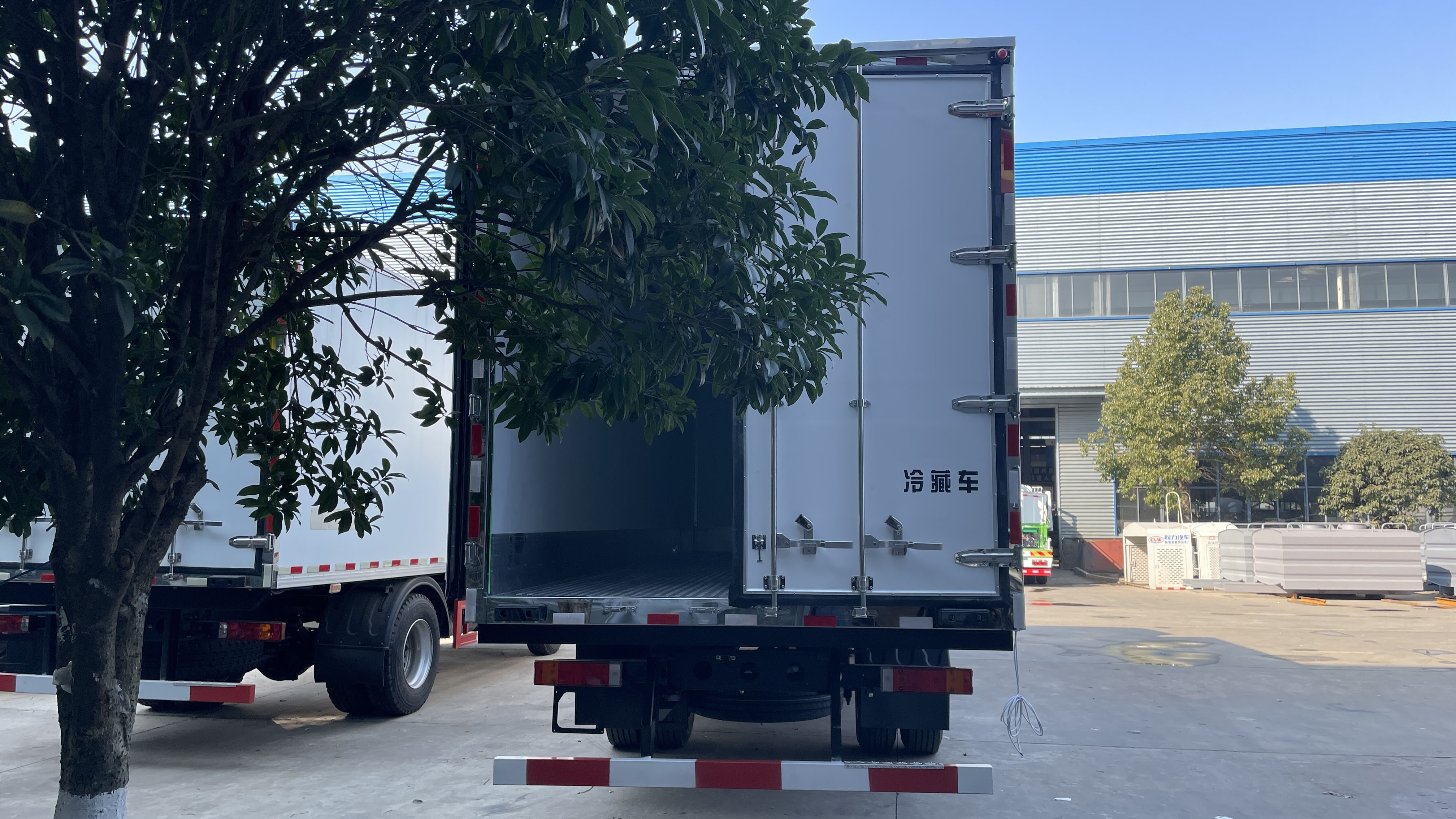 二、廂體配置:采用我司《晶龍工藝》專利技術——1200噸液壓加熱固化設備一體成型生產線制造,廂體保溫技術達到國家A級標準,廂體尺寸:6300,6500,6800×2400×2500(mm)。工藝特點:1、廂板采用全密封樹脂膠粘連聚氨酯發泡板高壓加熱固化而成,厚度8cm;2、廂板內外面料為2.5mm厚新款納米玻璃鋼(不吸光,隔熱性好,硬度強,抗氧化);3、粘連輔料為玻璃纖維絲布;4、無空隙填充聚氨酯發泡保溫材料;5、全密封樹脂膠粘連;6、預埋實木加固廂體;7、防銹處理槽鋼框架支撐;8、鋁合金包邊、不銹鋼包角;9、內部加裝LED照明燈及廂體示寬燈;10、后門框、鉸鏈、鎖件均為不銹鋼材質;11、后門加裝防撞膠塊;12、采用三元乙丙橡膠密封條。