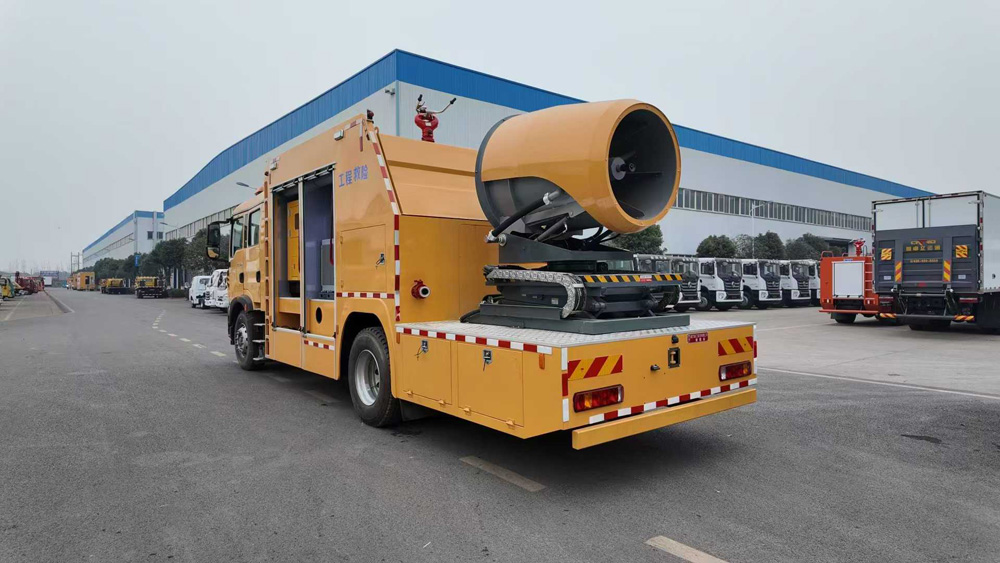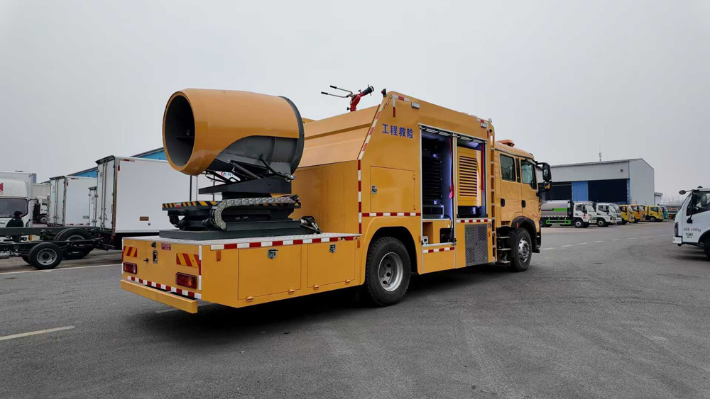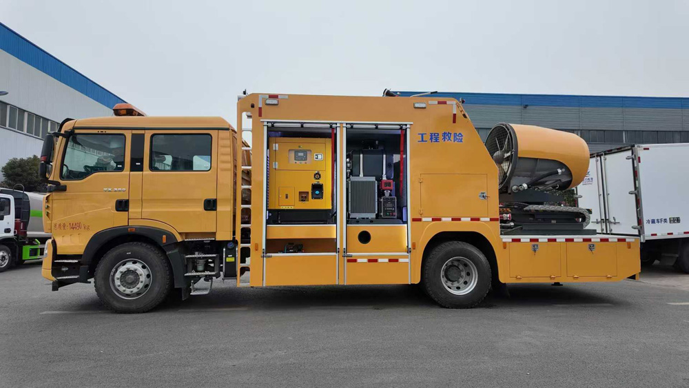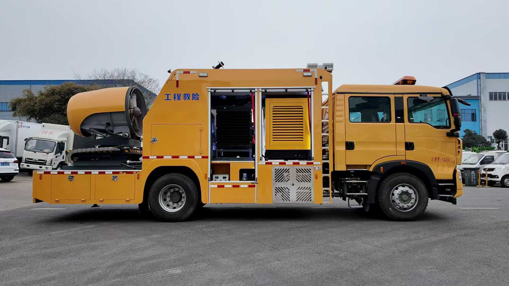 四、其他說明: 該車主要專用裝置為發電機,送風機,用于為隧道,地下管廊排出內部氣體,輸送空氣等.側面防護為裙板結構,材料均為Q235B碳鋼,后部防護裝置材料:Q235B碳鋼.